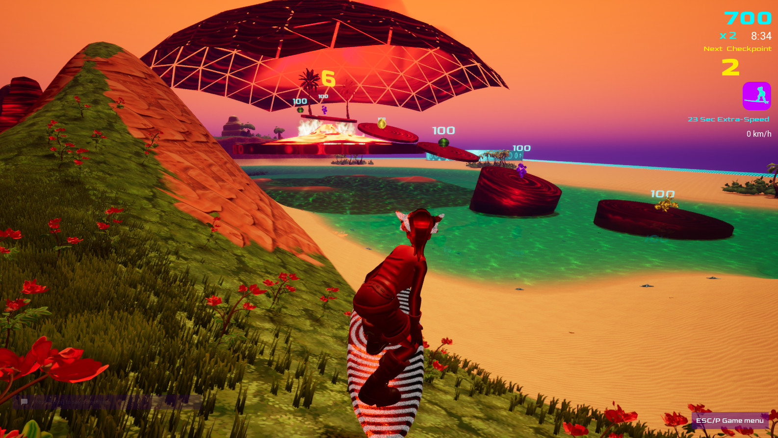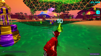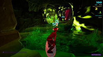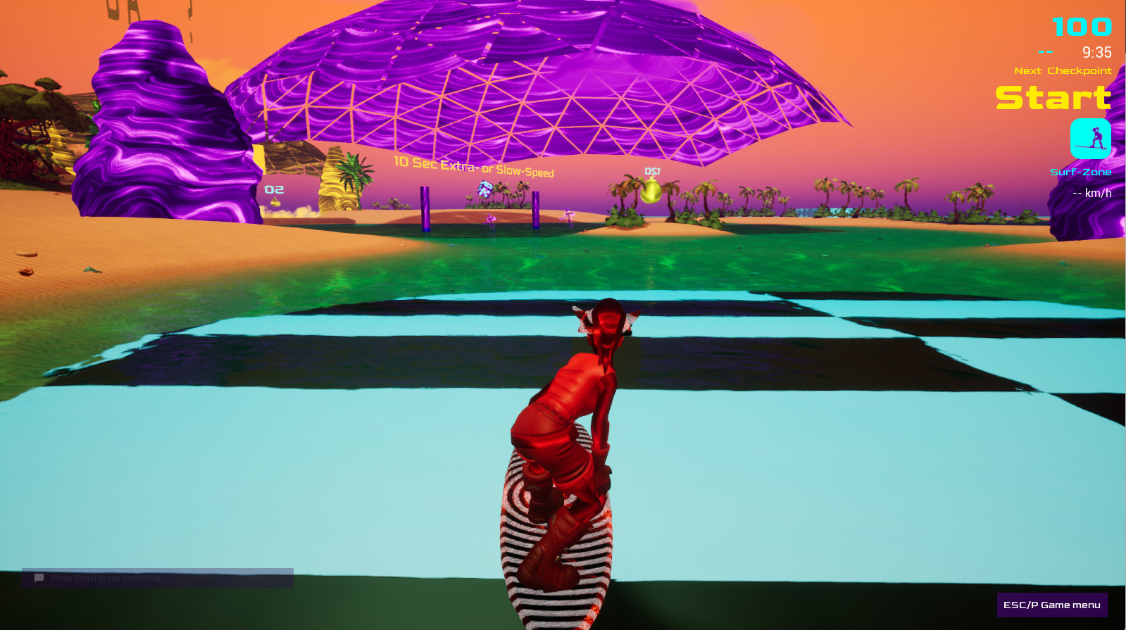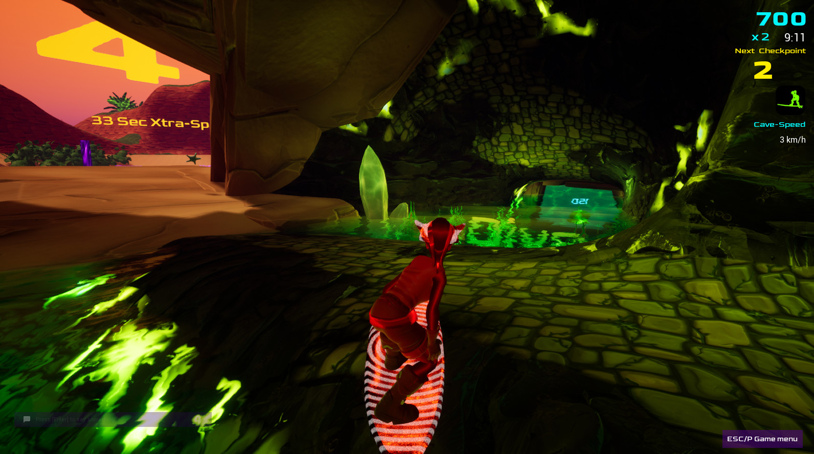 During a 10-minute race (press R to start a race), you surf over waves and dunes (yes, your board is also a hoverboard), through caves, and dive underwater, trying to collect as many points (drops) as you can (fruit and crystals) in those 10 minutes.