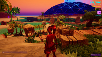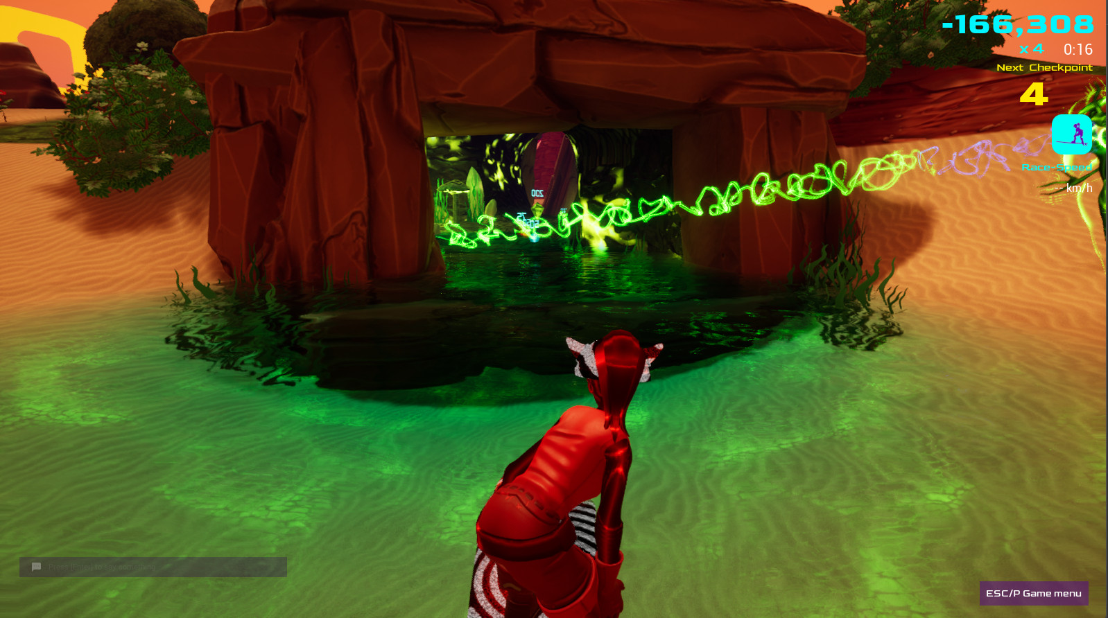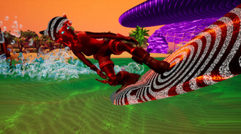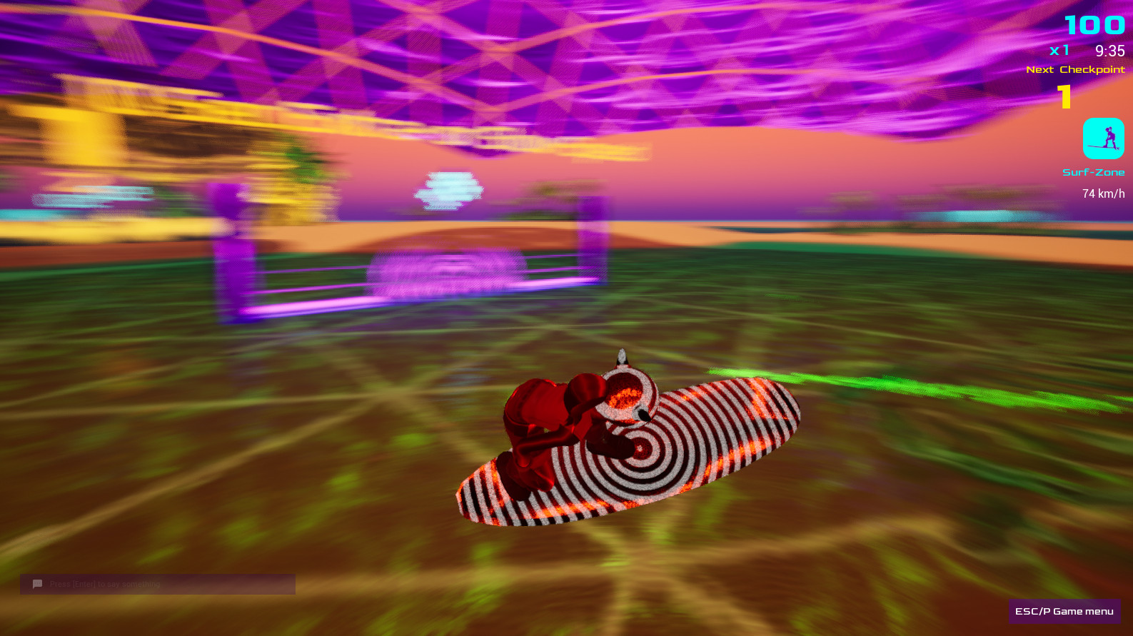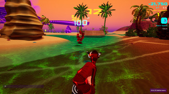 During a 10-minute race (press R to start a race), you surf over waves and dunes (yes, your board is also a hoverboard), through caves, and dive underwater, trying to collect as many points (drops) as you can (fruit and crystals) in those 10 minutes.